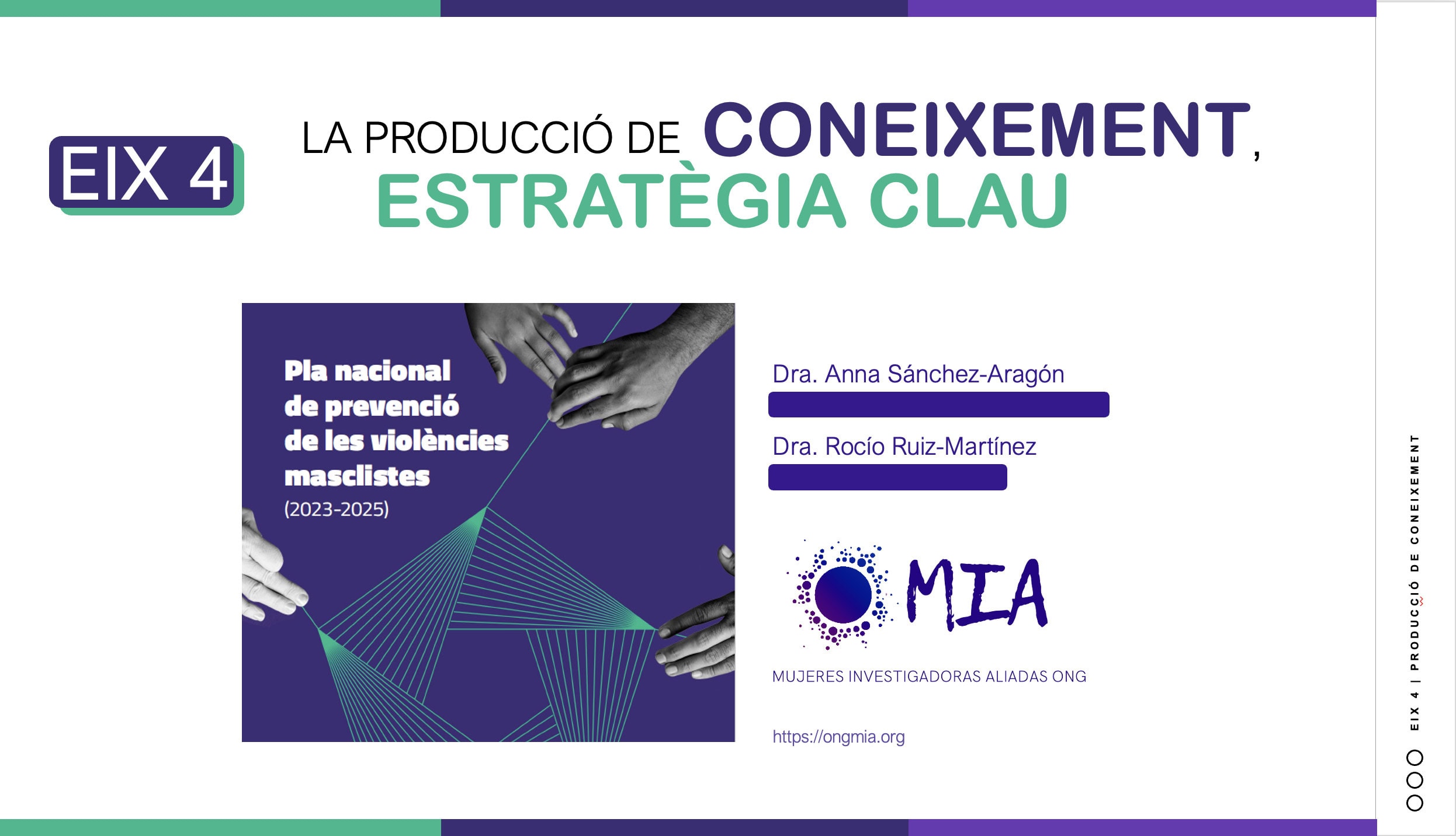 A partir de la convocatoria del Consell Nacional de Dones de Catalunya, ONG MIA puso a disposición a dos expertas para elaborar un informe y una presentación sobre uno de los ejes del citado plan, elaborado por el Departament d’Igualtat i Feminismes de la Generalitat de Catalunya.