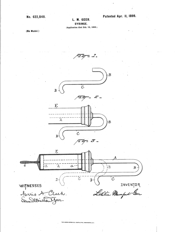 En abril de 1899, Letitia Mumford Geer obtuvo la patente con el número US662.848A. En aquella época tan solo el 1% de las patentes en Estados Unidos eran de mujeres. Por un lado, la representación de estas en la ciencia y tecnología era muy escasa. Por otro lado, a las mujeres se les exigía proporcionar una mayor cantidad de evidencias que demostraran que eran las verdaderas inventoras del objeto para el cual buscaban obtener la patente. En general, el proceso era más sencillo si contaban con el apoyo de un abogado, pero muchas de ellas no tenían los recursos para contratar uno.